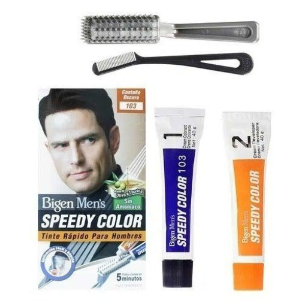 La primera Tintura para hombres de acción rápida. Cuando llegan las canas no necesariamente llega la vejez, sabemos que tienes toda la vitalidad y energía haz que tu apariencia sea la muestra de ello. Pensando en tí Bigen crea Men´s Speedy Color, una tintura para hombres con cinco tonos que se adaptan a todas las tonalidades de cabello. Aplicación fácil, rápida. Nuestra revolucionaria fórmula es tan práctica, que sólo necesitaras dedicarte 5 minutos antes de tu baño habitual, para lucir natural con el cabello brillante y por qué no, más atractivo que nunca. Speedy Color brinda un brillo y un realce de color para todos los hombres que quieren renovar su imagen. ¿Qué esperas para darle un giro a tu imagen? El momento es ahora.